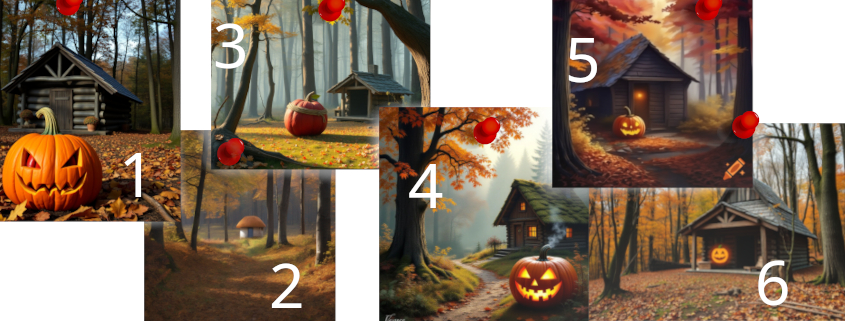 Um die zweite Frage zu beantworten, habe ich mal verschiedene kostenlose Bildgeneratoren, bei denen man sich nicht anmelden muss, ausprobiert. Immer Standardeinstellungen. Immer mit dem gleichen Prompt (der gleichen Beschreibung): Herbstlicher Wald mit einer Hütte, vor der ein Kürbis mit einer Fratze steht.