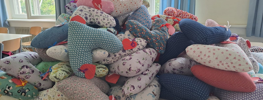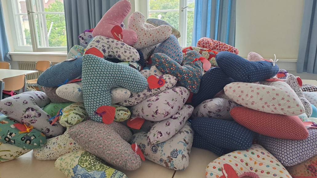 Im Rahmen der Projekttage am Ende des vergangenen Schuljahres beteiligte sich eine Gruppe von 21 Schülerinnen und Schülern mit Frau Feder und Frau Winterholler am Projekt „Herzkissen für München“.