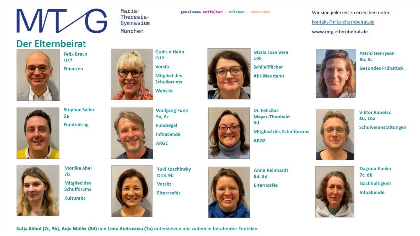 Persönlich kann jedes Mitglied des Elternbeirats über die Mailadresse vorname.nachname@mtg-elternbeirat.de erreicht werden.