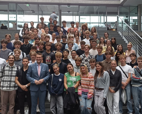 Politik können die Jugendlichen erleben durch Exkursionen, Vorträge oder Planspiele. Besonders anschaulich wird es in der 11. Klasse bei der Berlinstudienfahrt. Sie entdecken, wie zentrale gesellschaftspolitische Debatten – etwa zu Fake News, Populismus oder gesellschaftlichen Spannungen – entstehen, welche Gestaltungsmöglichkeiten sie selbst haben und wie politische Entscheidungen getroffen werden. So können sie sich aktiv entfalten, indem sie eigene Meinungen entwickeln, vertreten und im Austausch mit anderen weiterdenken.