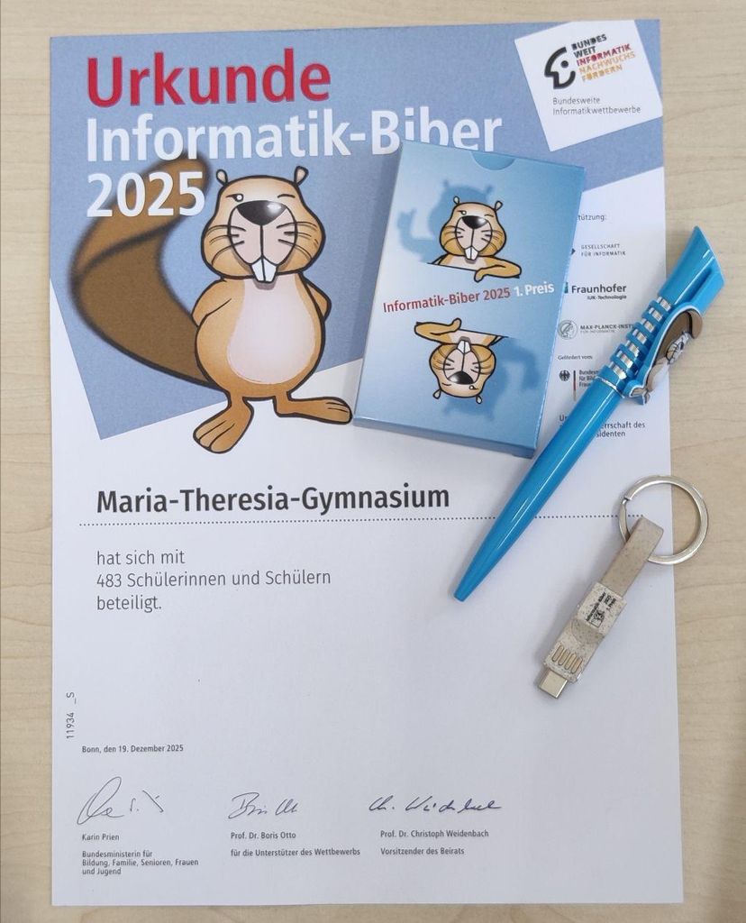 Knapp 500 Schülerinnen und Schüler von der Unterstufe bis zur Oberstufe haben im November wieder mal erfolgreich am Informatik Biber teilgenommen! Nun konnten wir 39-mal einen 2. Preis und 55-mal einen 1. Preis verteilen – wieder einmal eine stabile Leistung!
